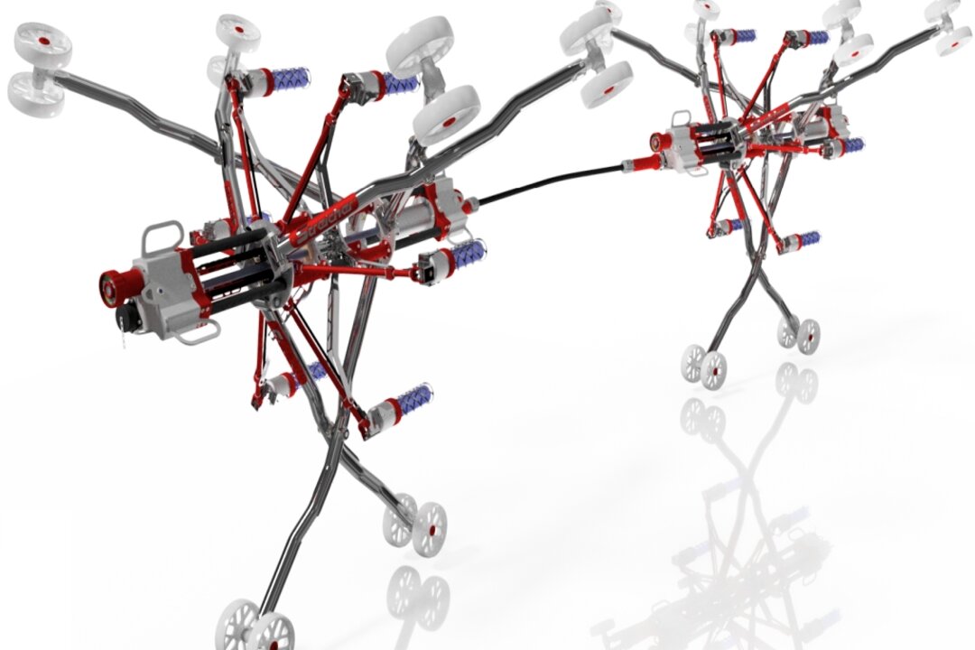 Resin-impregnated glass fiber inliners are efficiently cured with the SK1500 light chain. Applicable in circular 600-1,500 mm profiles. The chain consists of two identically constructed, self-sufficient cores. Each core has four radially arranged UV lamps each with 1000 watts. The installation of ldiverse "legs"of different lengths allows adaptation to different pipe diameters. Electrically moveable legs and radiators. When the chain is in the liner, legs extend and lift the cores up. At the same time, the radiators extend in the direction of the pipe wall in order to irradiate the laminate with as high a light intensity as possible. An indicator on the panel informs about the current extension position. With motor overload, the movements are stopped. Shortliners may also be driven with one core alone. Heat-resistant Teflon wheels prevent the adhesion of resin particles.